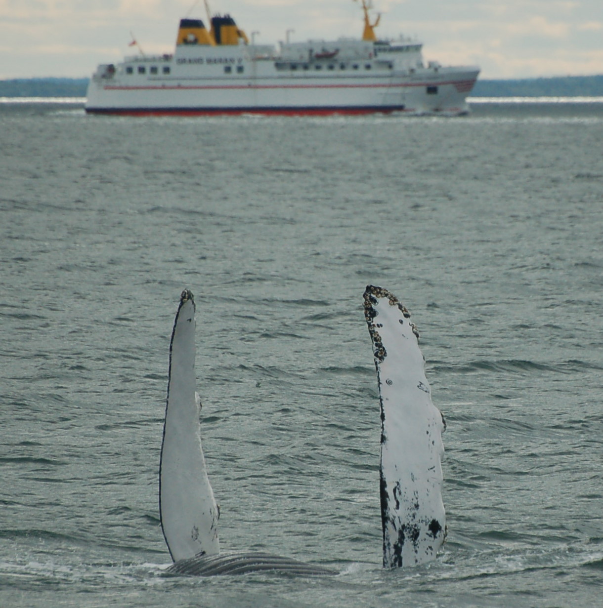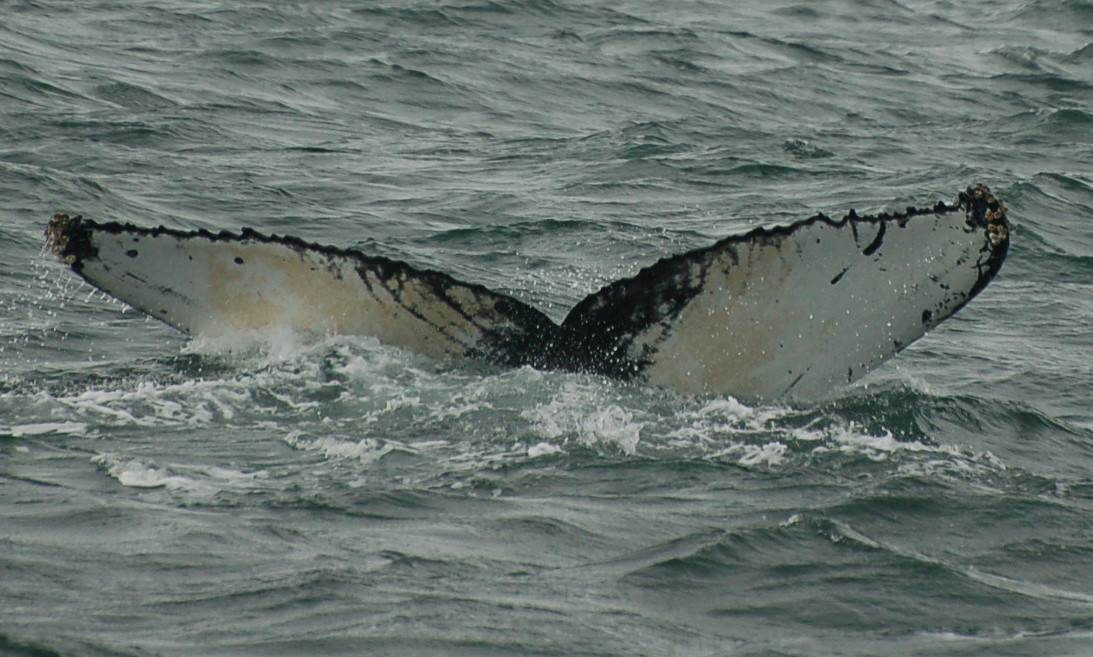 Today was one of those days that you might as well have not even checked the weather forecast because it was not accurate in anyway but that is where some flexibility comes into play. We spent our morning trip off Bliss Island with 3 fin whales and we got some great looks. Our 2pm departure started out in the same way….we has atleast 5 fin whales in the area and we got some incredible looks and the wind was diminishing so John decided to run us offshore in search of humpback whales. We made out way out past South Wolf and towards the Bank and as soon as we slowed down to give the area a good look John picked up a low and bushy blow of a humpback whale. We made our way over and got some great looks at Chevron, a young whale we saw for the first time last season.