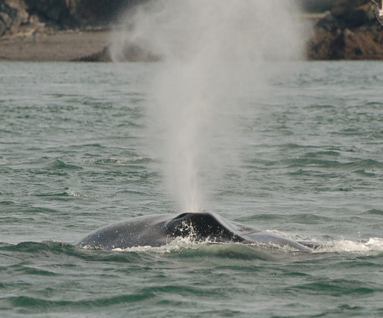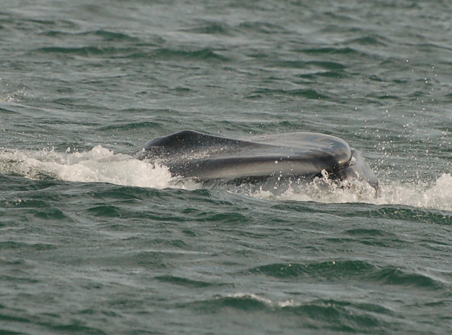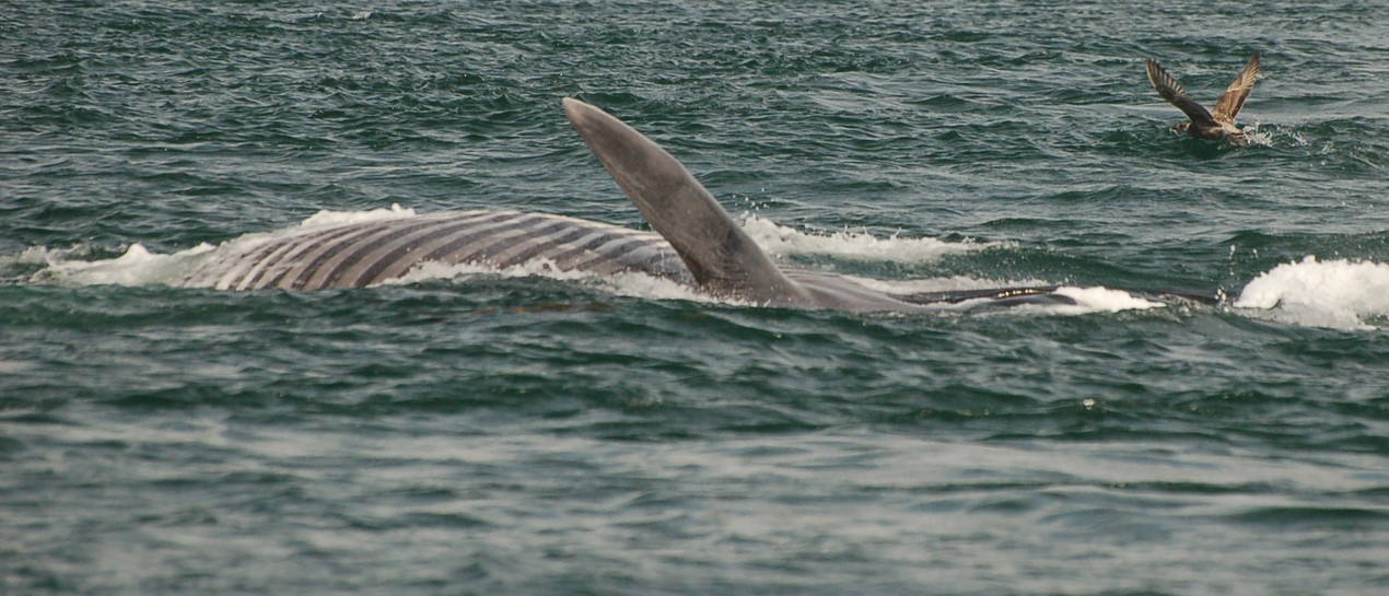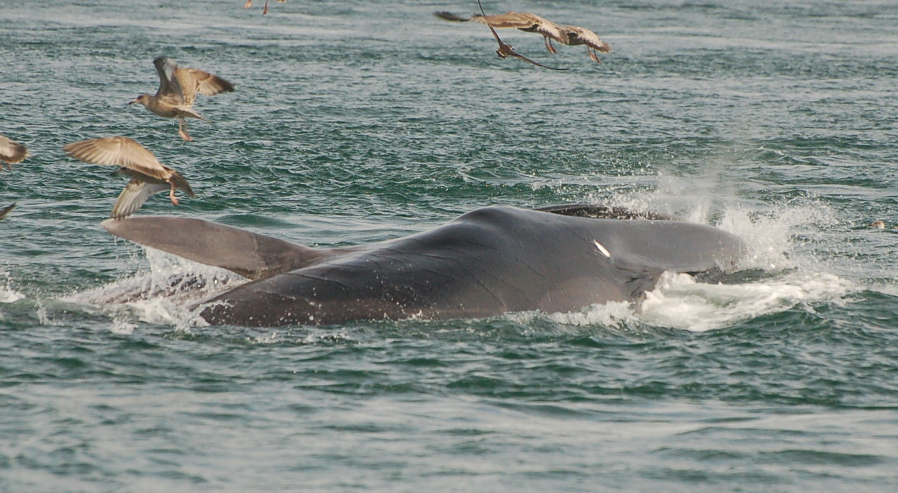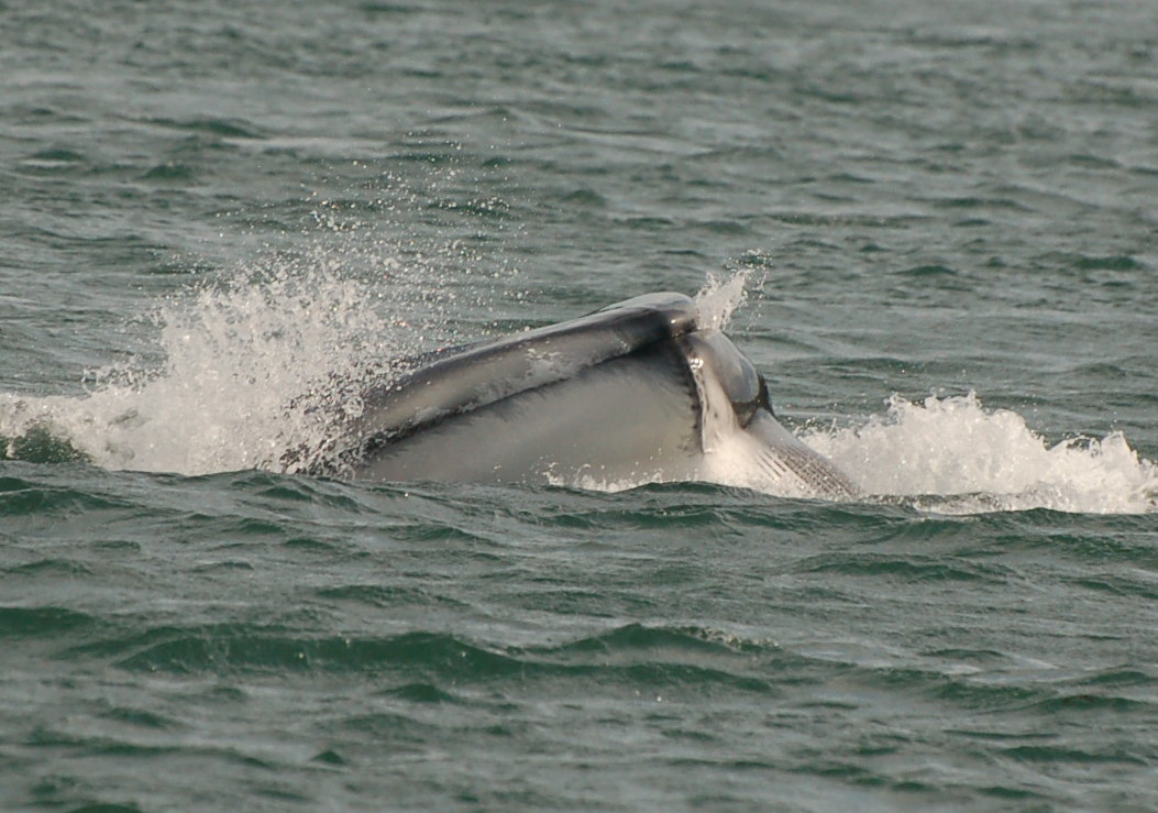 Another lunge feed on the side, with both the pectoral and half of the fluke out of the water.