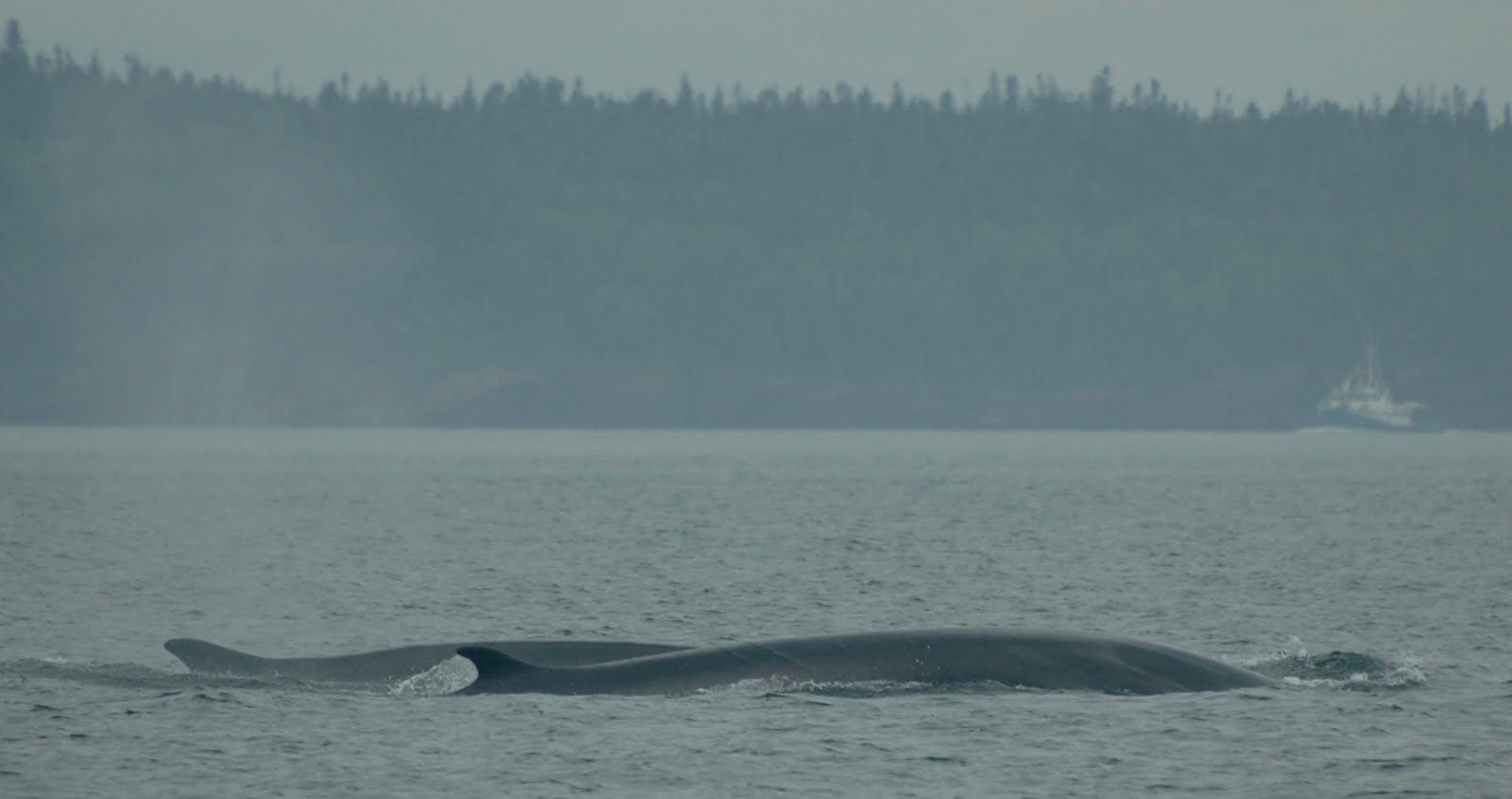 Our morning trip was delayed by 30 minutes but the patience payed off and we were able to get out on the water and head towards the Bliss/Blacks shoreline where we found the mother and calf fin whales we saw the day before. They were a pleasure to watch and we were able to get some really close looks at both of them and our passengers were able to appreciate the size difference between the adult female and her young baby born just this past winter. Below is a picture I took yesterday of the mom and calf, the calf is closer to the camera, I know it’s hard to see the size difference, but trust me, mom is HUGE.