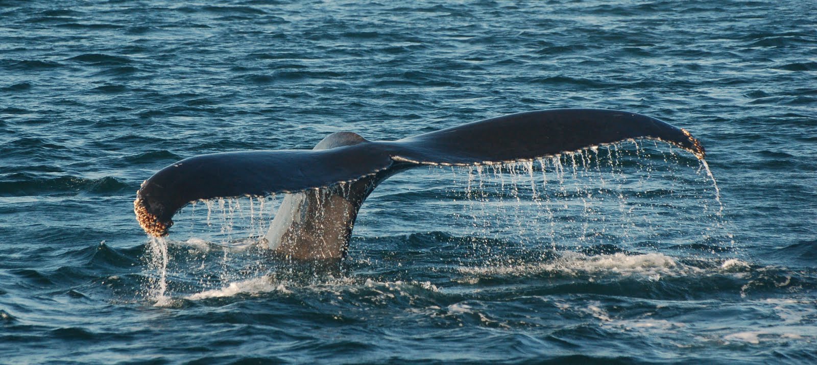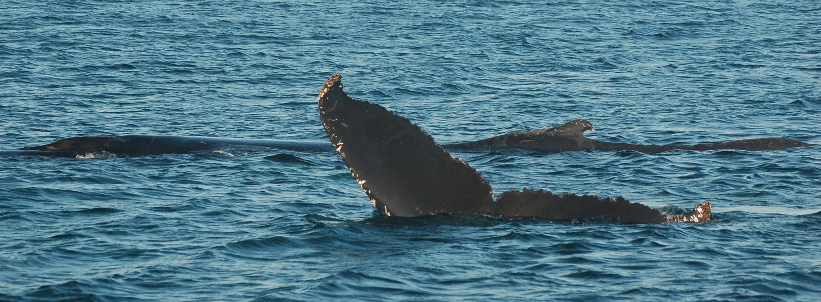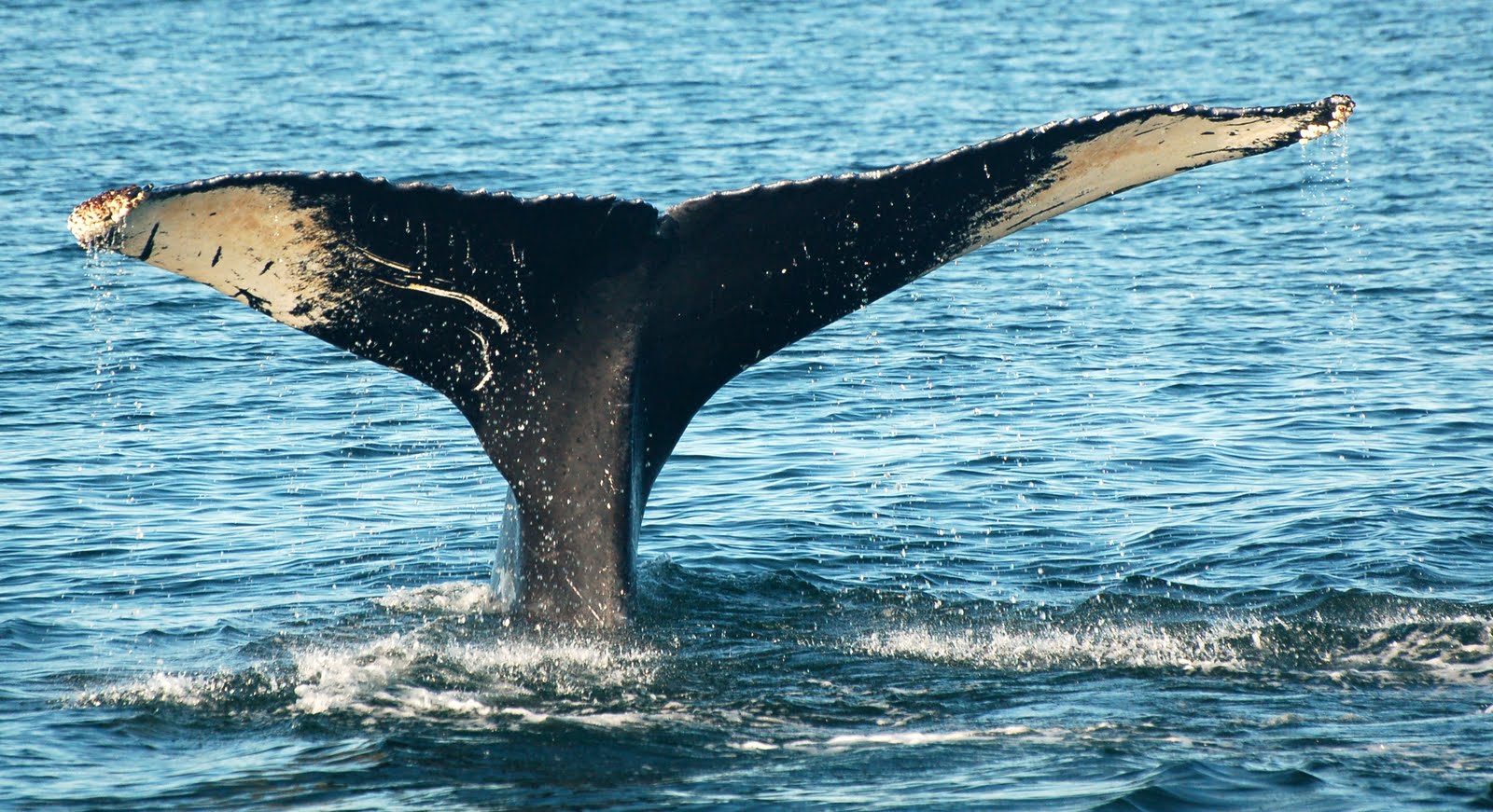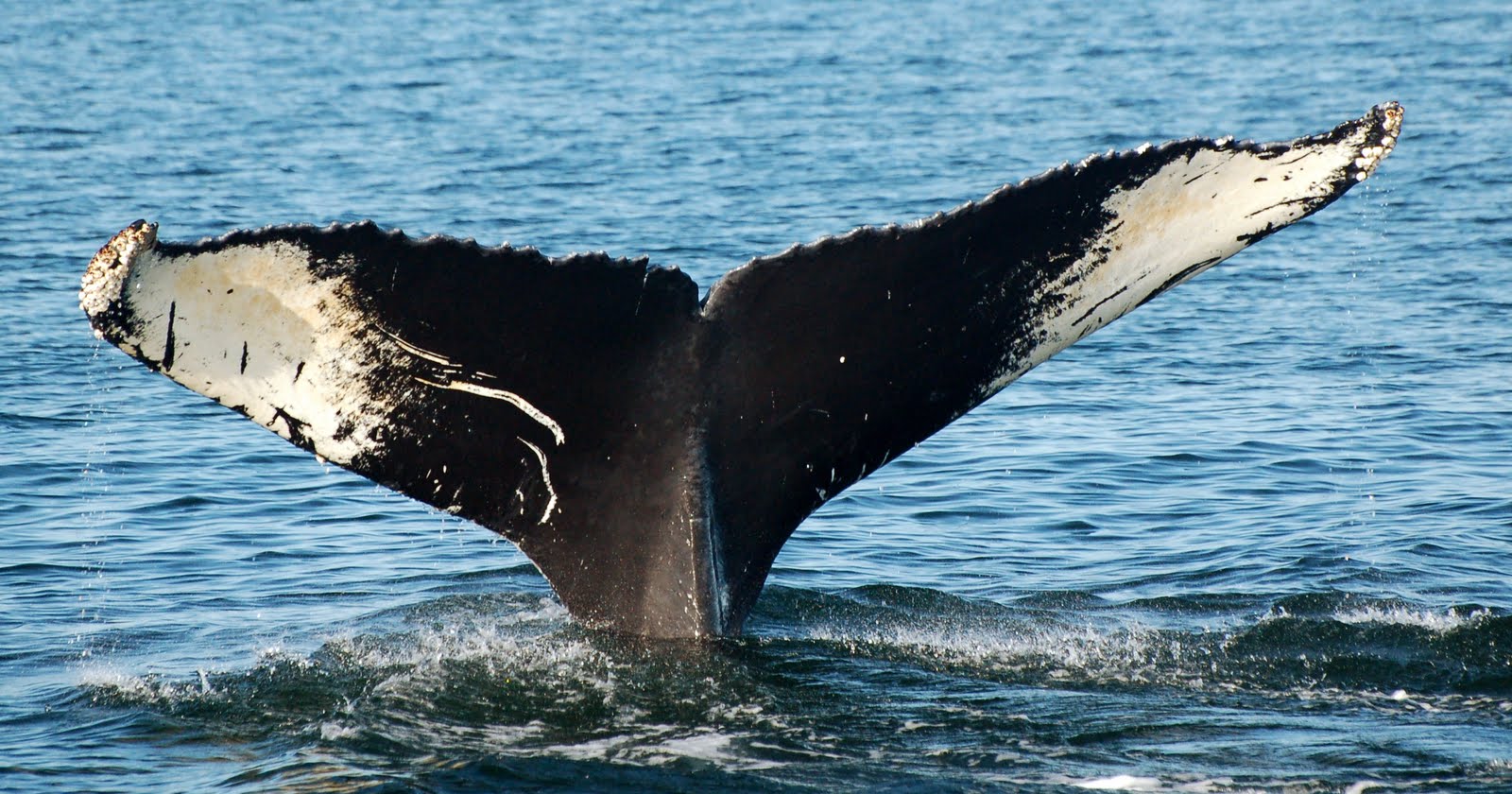 Humpback whales are easily (fairly easily) identified by the black and white patterns or pigmentation on the underside of their flukes as well as by the shape of their dorsal fin and the jagged trailing edge of their tail.