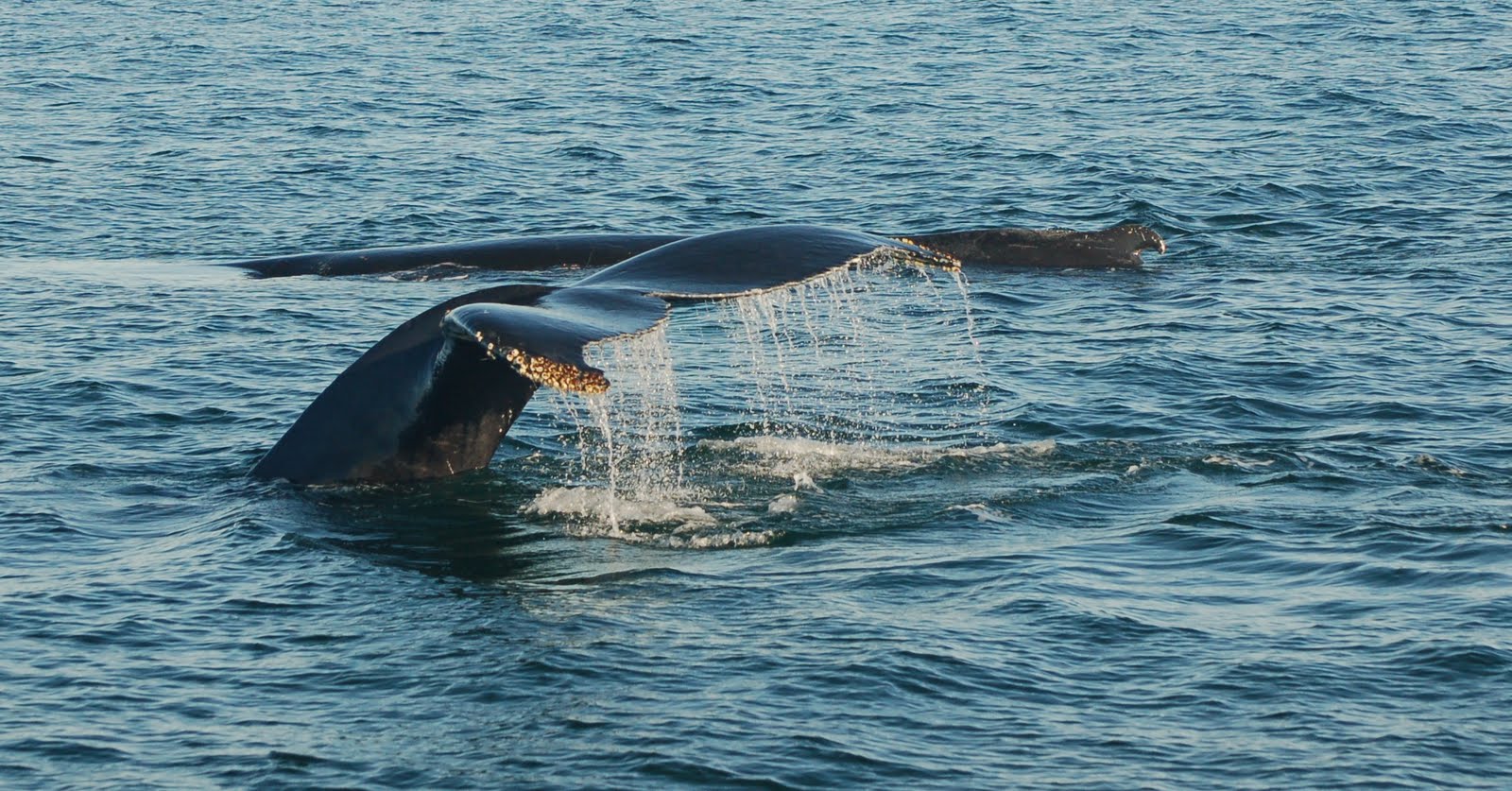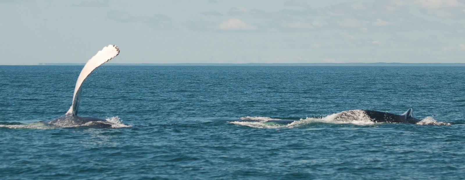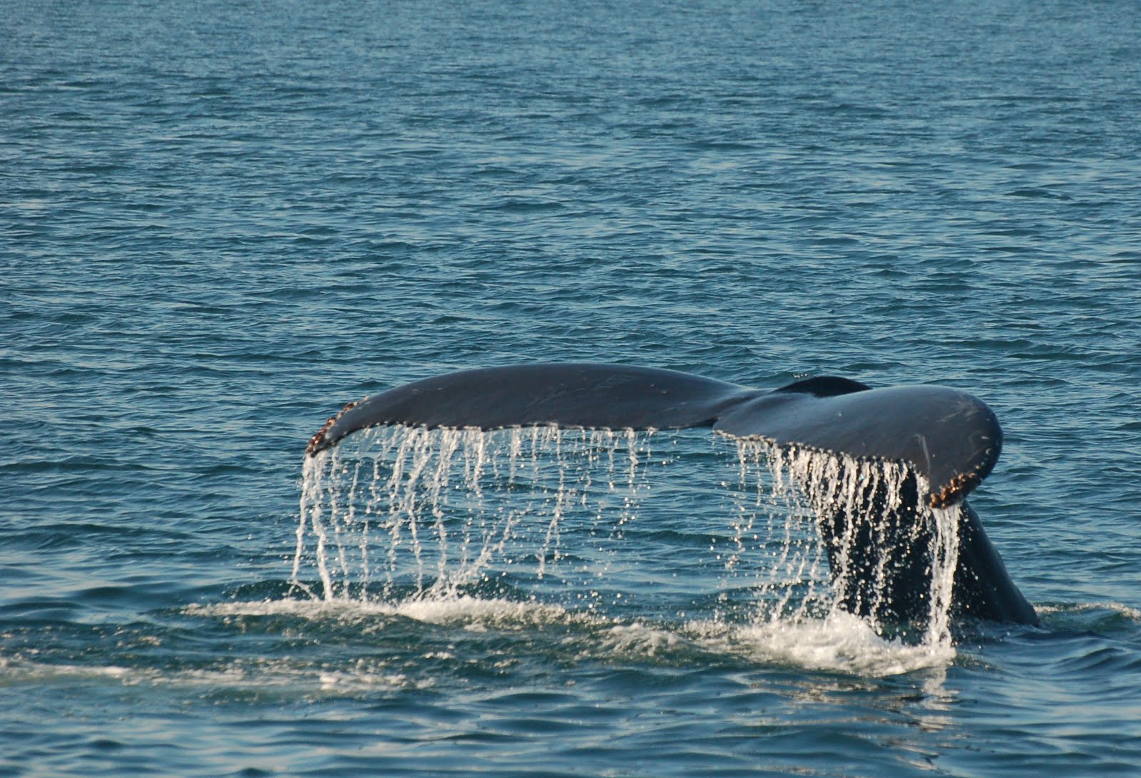 Humpback whales are easily (fairly easily) identified by the black and white patterns or pigmentation on the underside of their flukes as well as by the shape of their dorsal fin and the jagged trailing edge of their tail.
