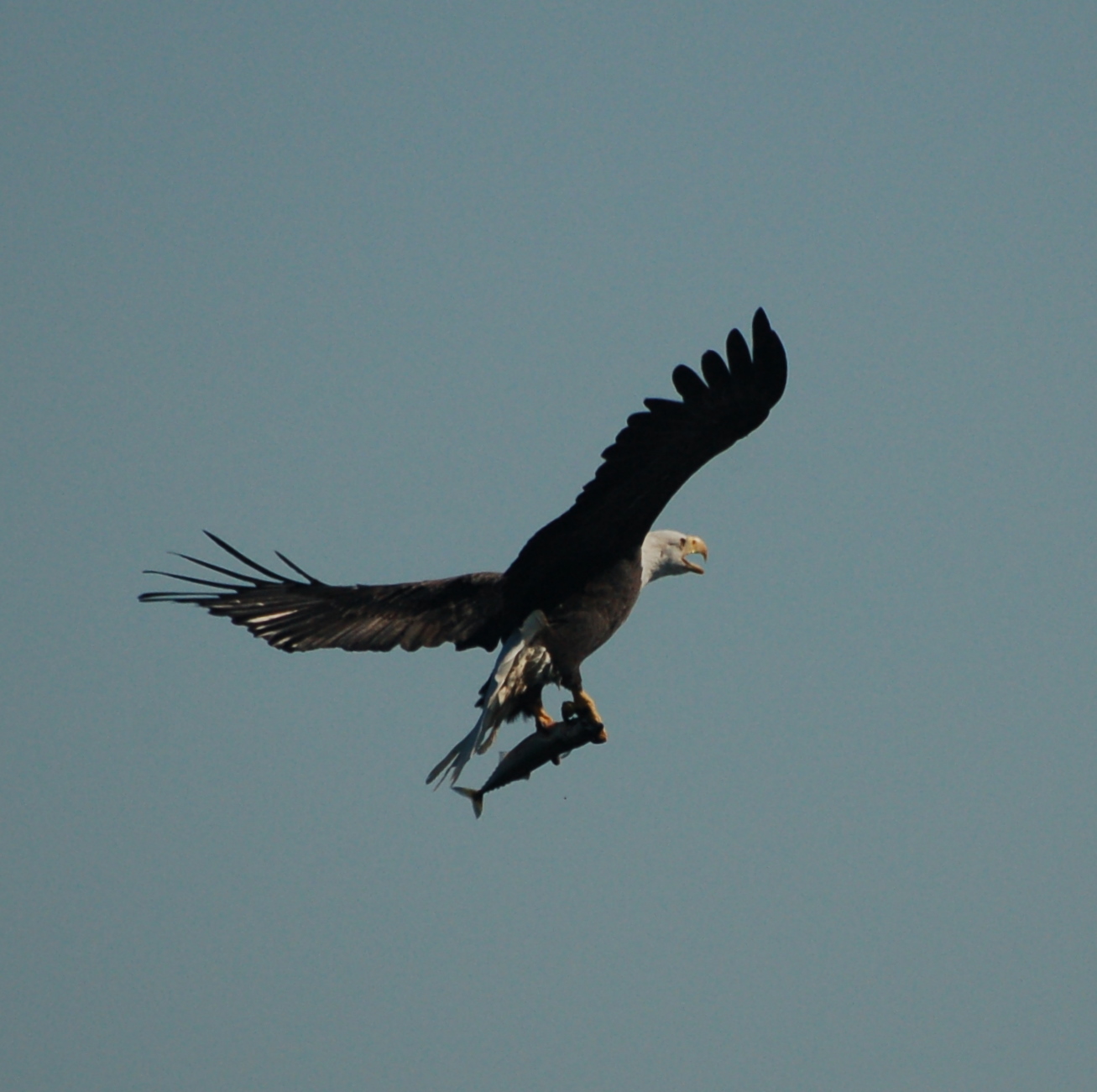 We also had a great bald eagle sighting this afternoon. An adult came in and landed with a mackerel in it’s talon and then started vocalizing as a young eagle came in the same area and fished. Not sure if the juvenile was a the young of the year of the adult eagle but it was an interesting interaction to watch. Here is a picture of the adult eagle calling, and note the mackerel in it’s talon.