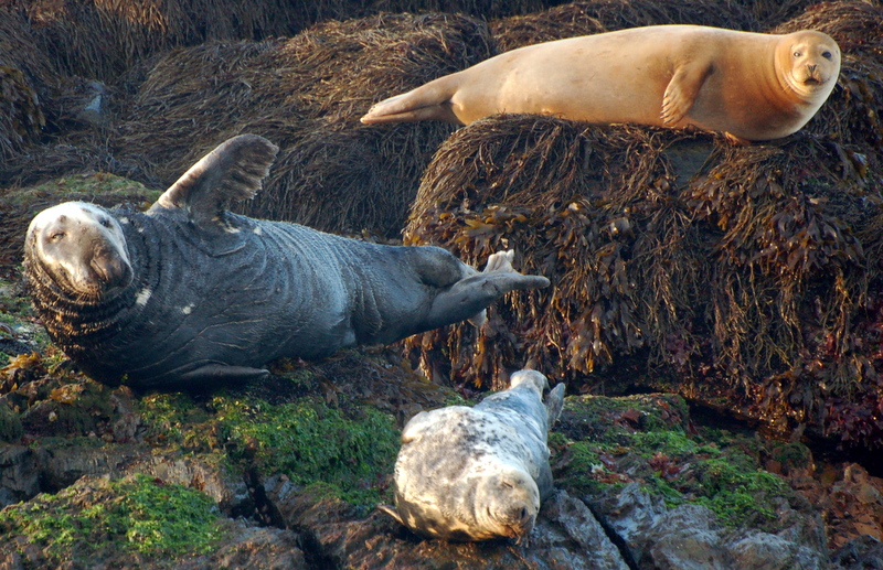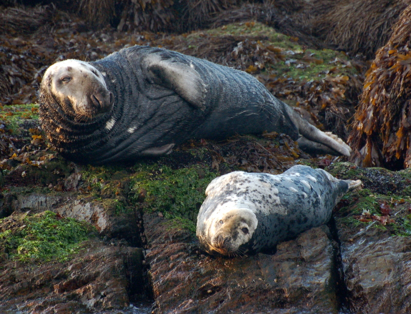 | I wanted to be able to show you the size, coat colour and head shape difference between a male (top)and female (bottom) grey seal. Taken on July 6/12 |