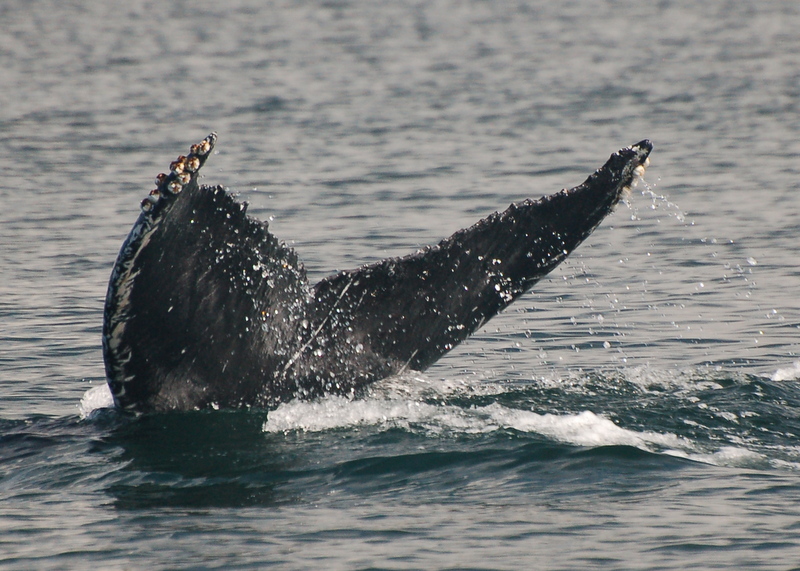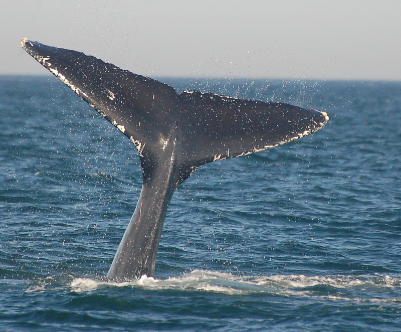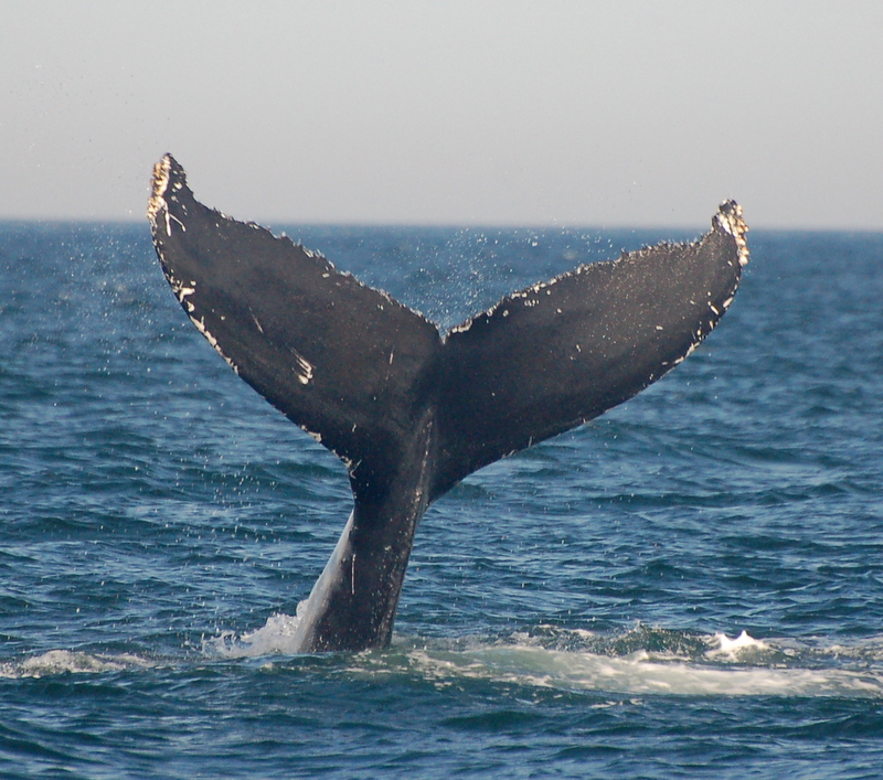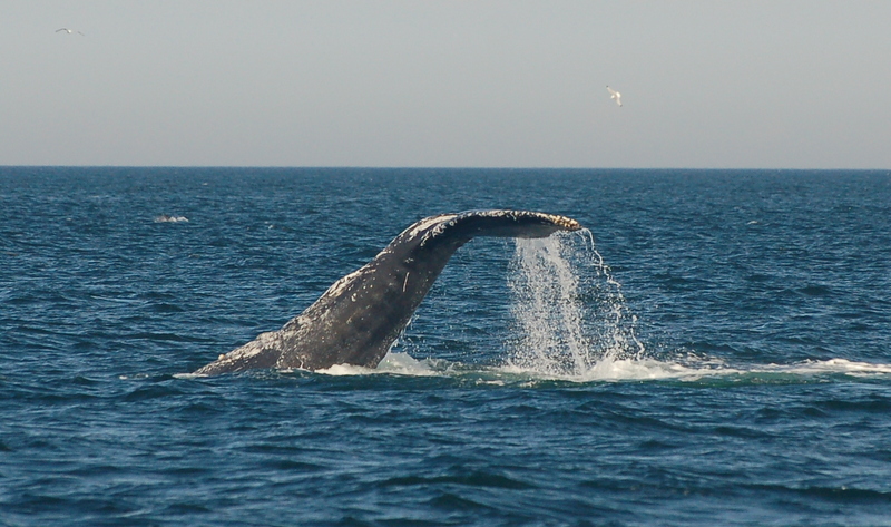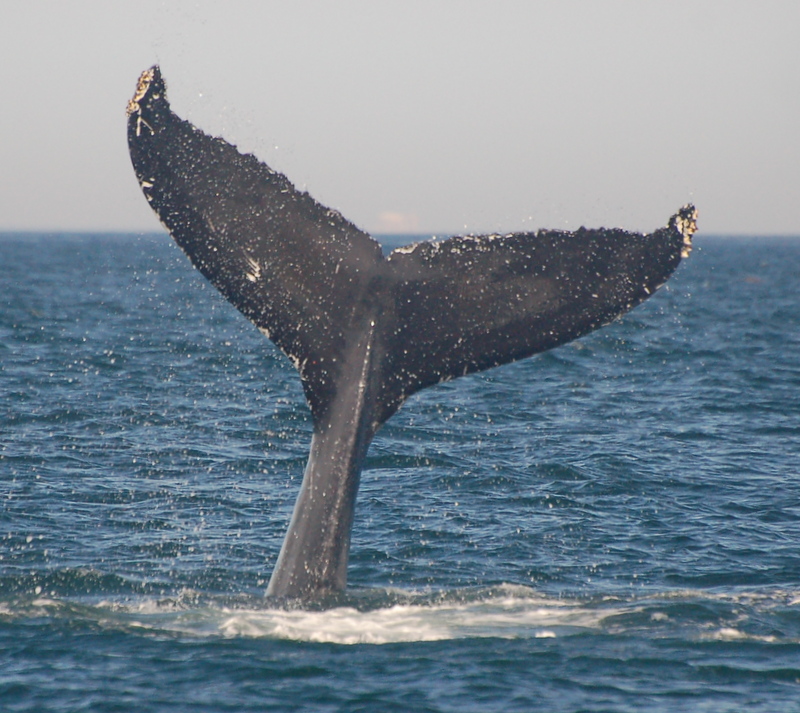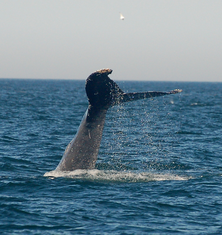 Our afterenoon started off a little slower, the fin whales were starting to spread out over about 2 miles but with some patience and keen eyes through binoculars we found a trio who were staying in about the same spot and got some amazing looks (one was very large, an estimated 60-65 feet). We had word that the young humpback was still around but could not get a good look until the end of the trip where we were treated to tail lobbing and tail breaching for about 5 minutes! Again, the patience paid off!